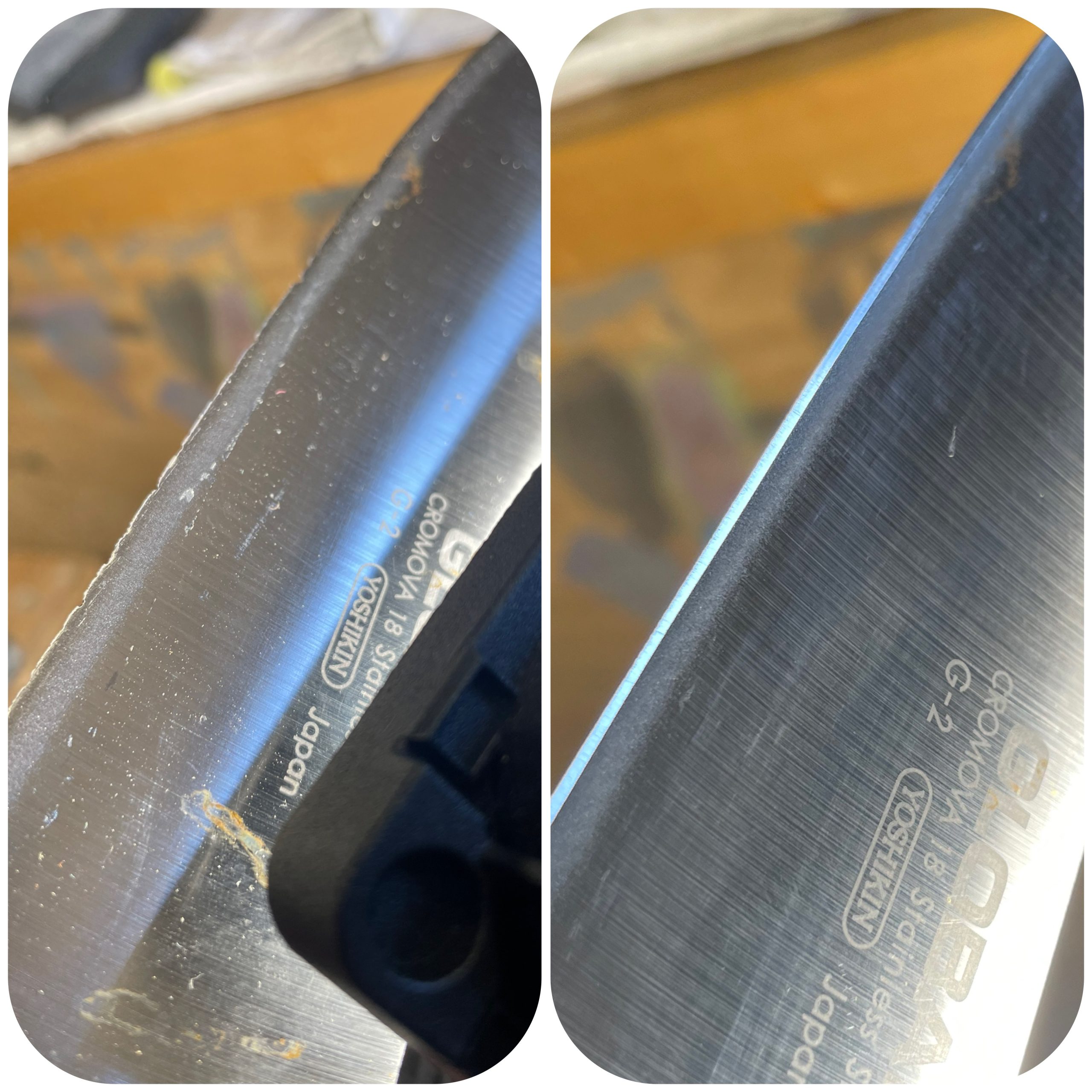 En bruten spets eller större hack åtgärdas genom att man slipar en ny profil av knivsryggen eller eggen. Man kan inte svetsa eller tillföra stål för att återskapa kniven till ursprungsform.